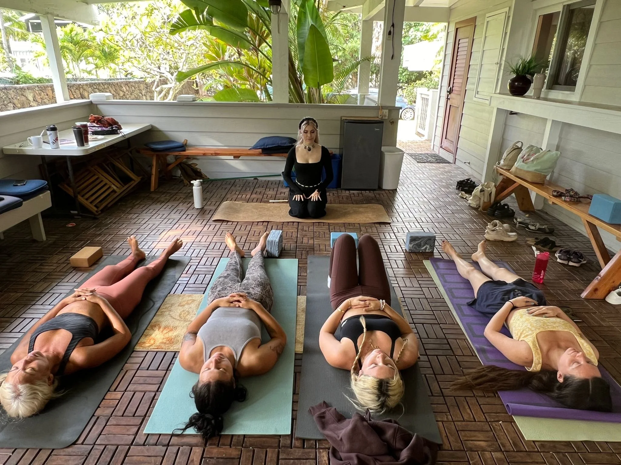 Each day begins with 8AM meditation and group study, followed by either a morning or evening yoga class. The afternoon includes teaching clinics, posture mechanics, and philosophy sessions. Days end with a 7PM dinner break, followed by space for reflection, integration, or self-study.