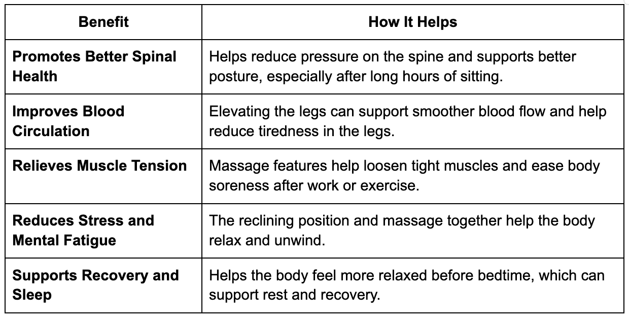 For people who spend much of the day sitting, the lower back often carries the most strain. The zero gravity position can help reduce spinal compression while the massage mechanisms work along the back muscles to ease tension.