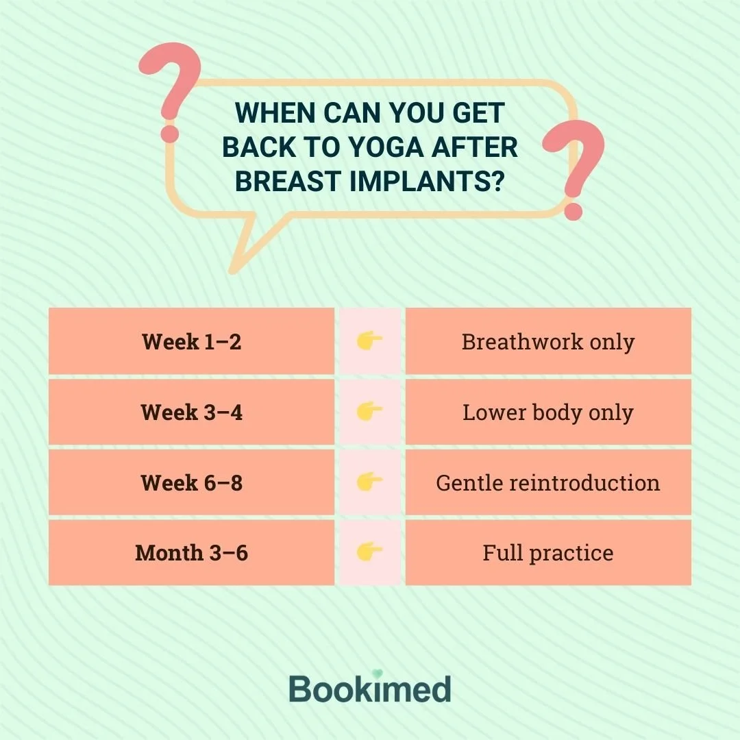 Patience is a central principle of yoga, and it has never been more relevant than during post-op recovery. Most surgeons recommend waiting at least 6 weeks after breast augmentation before resuming upper-body exercises, especially if your implants are under the muscle.