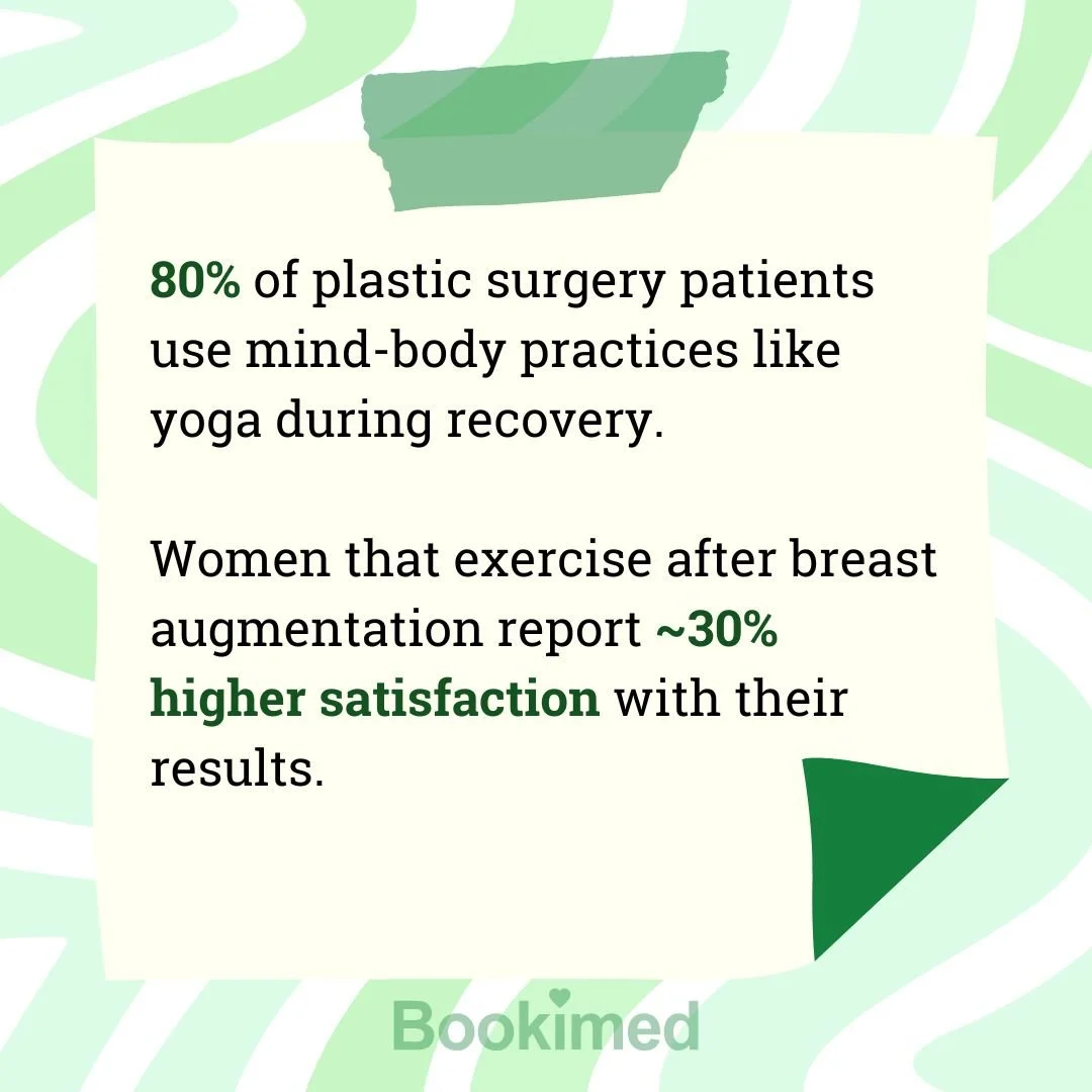 Once your surgeon gives you the green light, yoga becomes a useful tool for healing. Up to 80% of plastic surgery patients incorporate mind-body practices like yoga into their recovery, and for good reason. One study found that breast augmentation patients who engaged in exercise not only healed without complications, but also reported higher satisfaction with their outcomes.